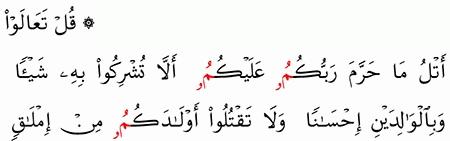 ق ل ت ع ال و ا أ ت ل م ا ح ر م ر ب ك م ع ل ي ك م أ ل ا ت ش ر ك وا ب ه ش ي ئ ا و ب ال و ال د ي ن إ ح س ان ا و ل ا ت ق ت ل وا أ و ل اد ك م م ن إ م ل اق ن ح ن ن ر ز ق ك م و إ ي اه م و ل ا ت ق ر ب وا ال ف و اح ش م ا ظ ه ر م ن ه ا و م ا