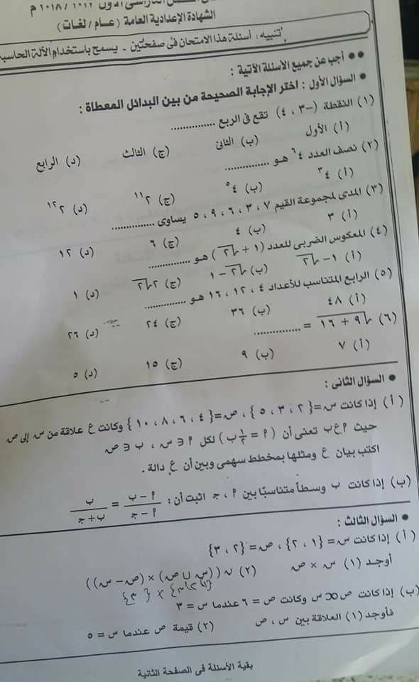 امتحان الجبر للصف الثالث الاعدادى ترم اول 2020 محافظة اسوان