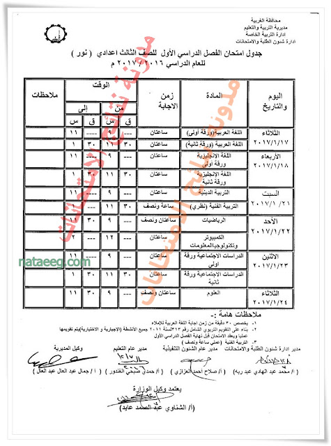 جدول امتحانات الصف الثالث الاعدادى الترم الاول مذكرة مصر