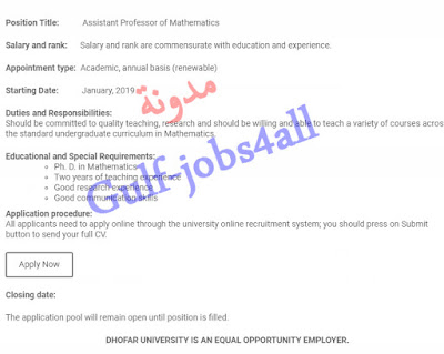 وظائف اعضاء هيئة تدريس بسلطنة عمان 2019 2020 بجامعة ظفار استاذ مساعد في الرياضيات منشور ديسمبر 2018